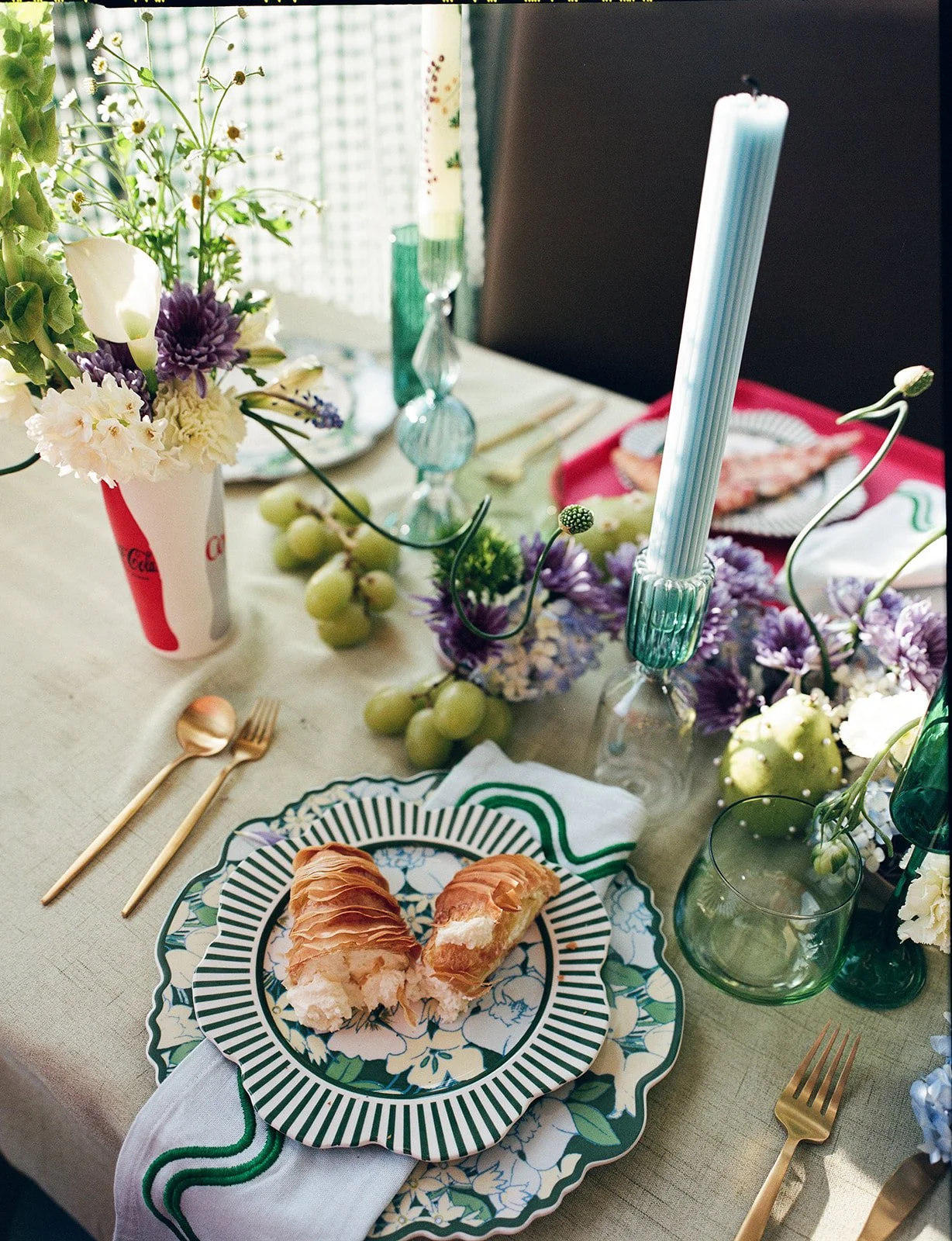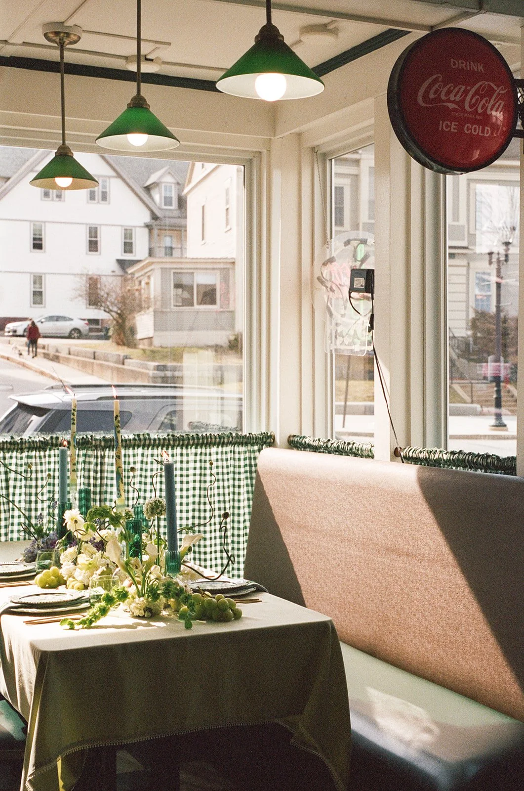 Florals were styled in contrast to the working kitchen and local dining room, creating a playful study in form, color, and unexpected beauty.