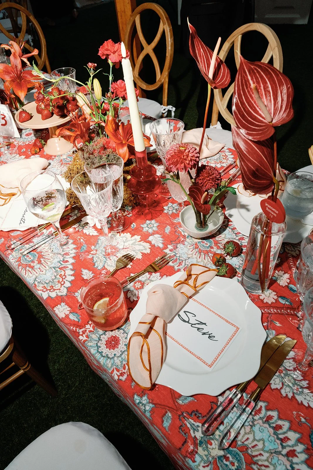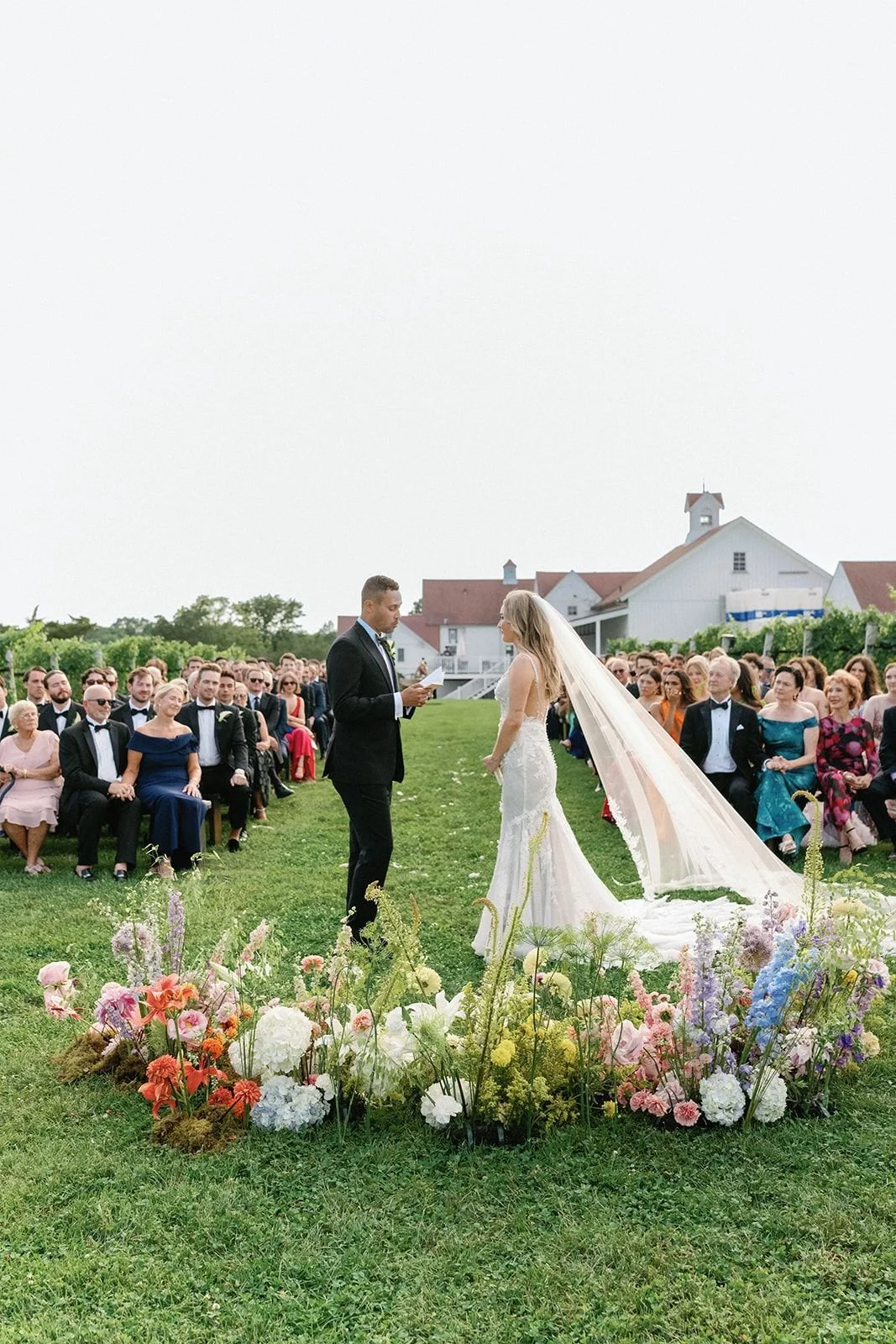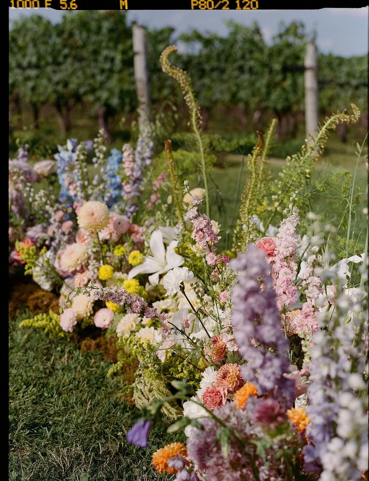 The ceremony set the tone with a rainbow half-circle installation built directly into the grass, composed of flowers sourced from around the world. This bold, polychromatic gesture carried through the day, from a dramatic hanging floral installation suspended above a checkerboard dance floor to a whimsical floral photobooth that completed the experience.