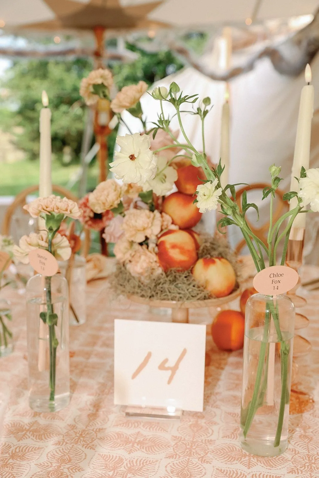 Color appeared most vividly in the moments guests interacted with directly. Coordinated bud vases doubled as escort cards and takeaways, guiding guests to their seats and inviting them to bring a piece of the celebration home. Seven color-coordinated cakes accompanied each table, reinforcing the palette and adding an unexpected layer of surprise and delight.